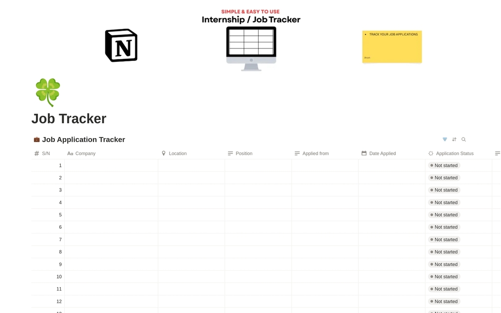 Built in Notion, this template gives you a clean, minimal table where you can track every application from start to finish. You can log the company, role, location, application source, date applied, and update your application status as you move through each stage.